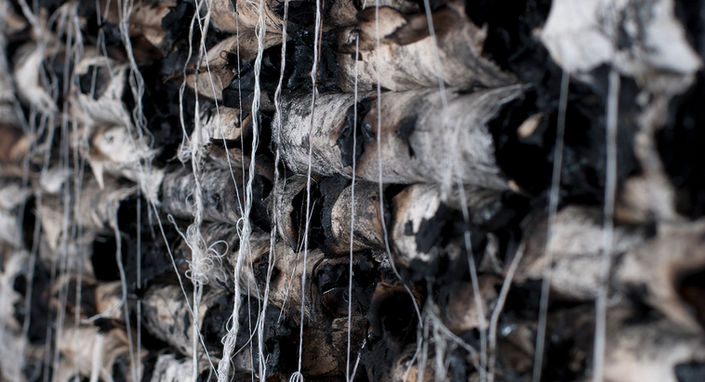 Burnt canvas, ash and fluorescent light on canvas