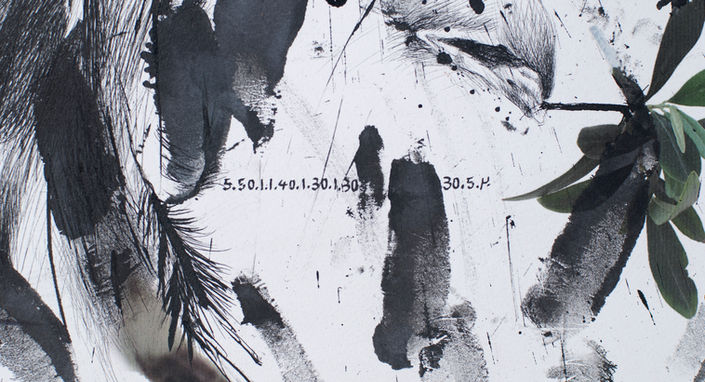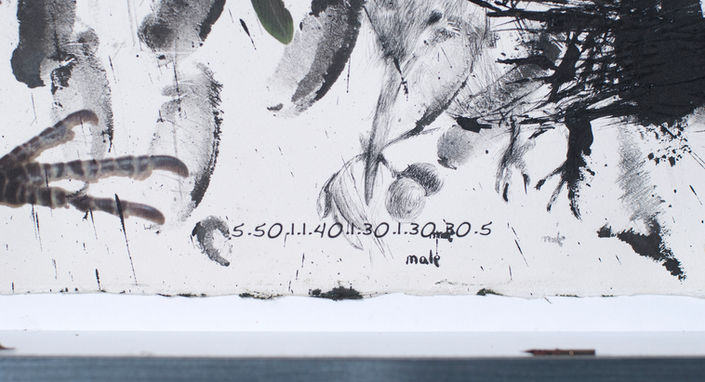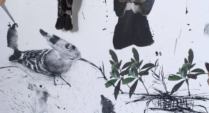 Drawing, digital print, hoopoe birds and pen nibs on paper in glass case